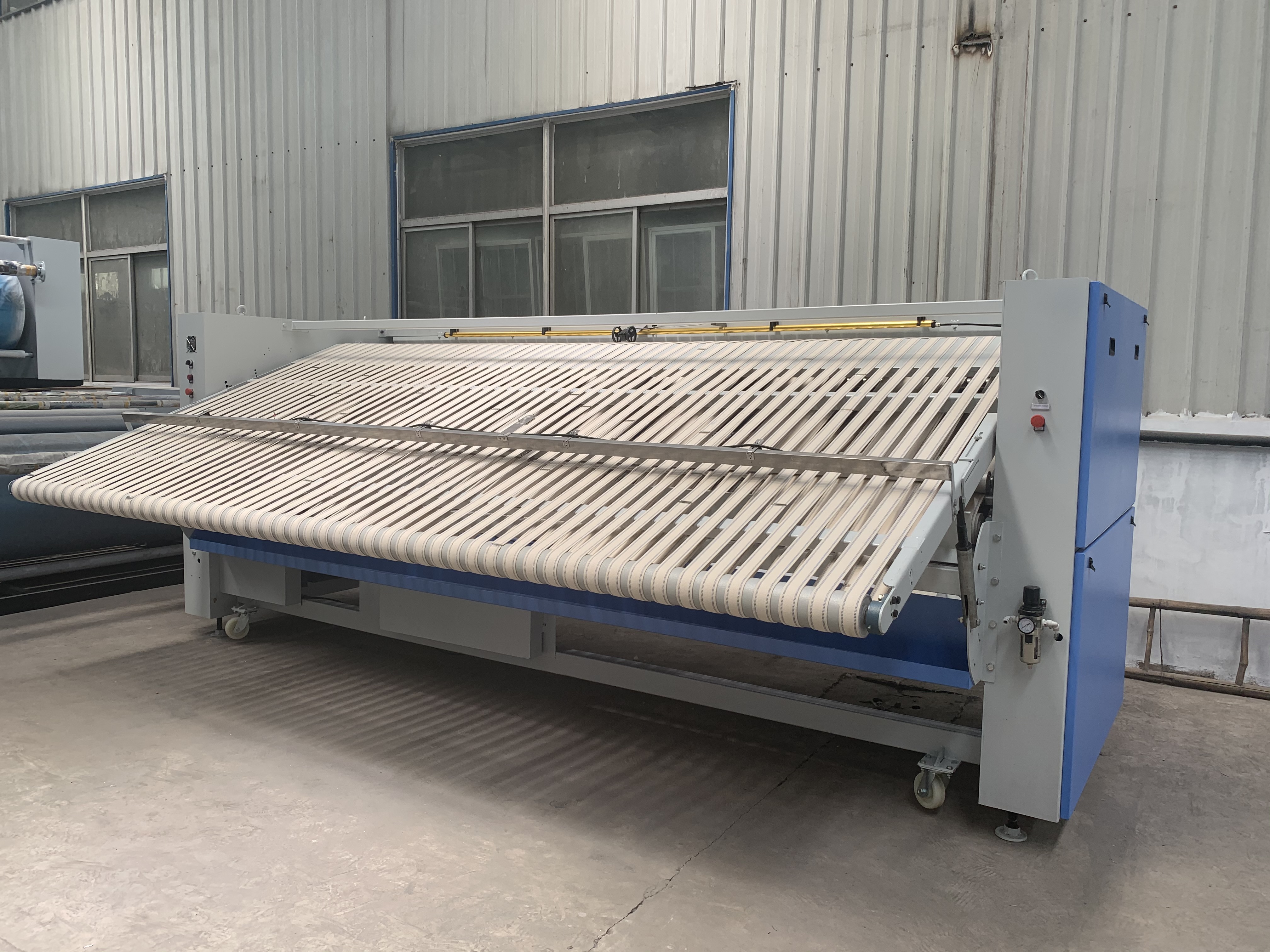 折疊機(jī)一款洗滌設(shè)備輔助機(jī)械產(chǎn)品,控制布料傳送系統(tǒng)的速度和定位,測(cè)定布料長(zhǎng)度并計(jì)算折疊長(zhǎng)度,通過(guò)氣流的噴射和折刀來(lái)完成水平折疊和交叉折疊。